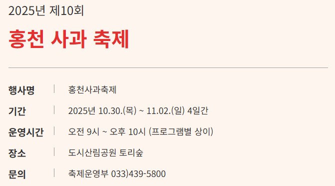 올해로 10회를 맞이한 홍천사과축제는 지역 농민들의 정성과 열정이 깃든 사과를 중심으로, 공연, 체험, 전시, 먹거리가 모두 어우러진 가족형 가을축제입니다.