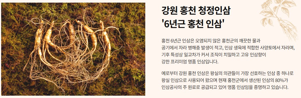 - 홍천 6년근 인삼은 뿌리 모양이 고르고 약효가 뛰어나 예로부터 약재로도 인기가 많았고,