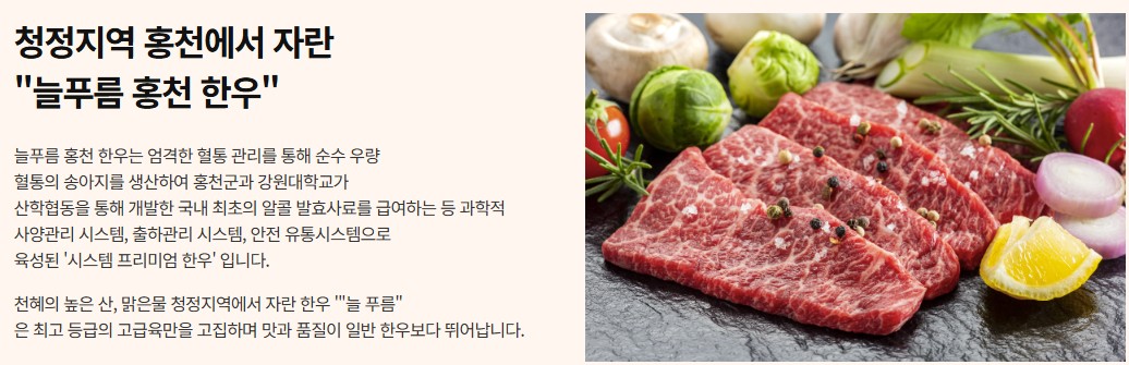 - 홍천 한우는 청정 자연에서 자란 사료로 길러져 육질이 부드럽고 풍미가 진한 것이 특징이에요.
