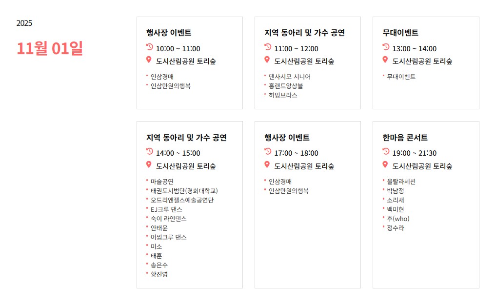 2025년에는 10월 30일(목)부터 11월 2일(일)까지 4일간, 홍천의 도심 속 힐링 공간인 도시산림공원 토리숲에서 진행됩니다.