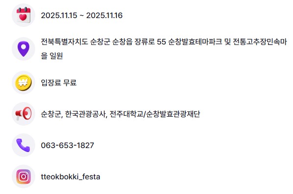 ‘K-FOOD를 대표하는 떡볶이’를 주제로 한 이번 축제는 발효의 고장 순창의 전통 고추장 문화를 기반으로, 다양한 레시피와 체험, 공연, 전시를 결합한 지역 특화 미식축제이다.