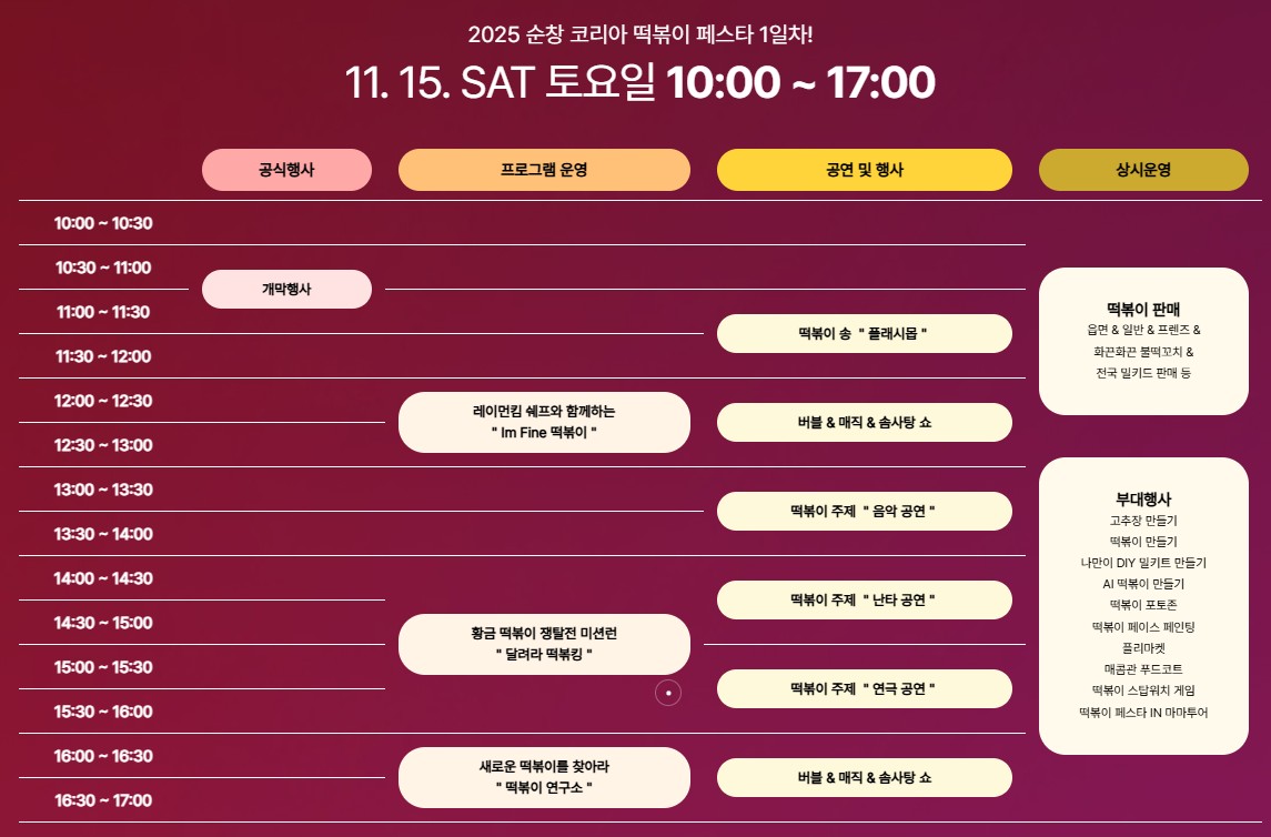 - 개막식 및 공식행사 : 10:30 개막, 11:00 떡볶이 송 플래시몹