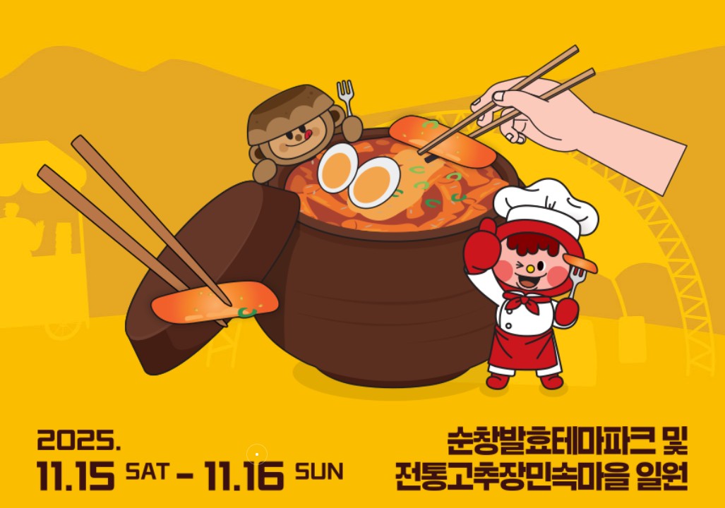 2025 순창 코리아 떡볶이 페스타가 11월 15일(토)부터 11월 16일(일)까지 이틀간 순창발효테마파크 및 전통고추장민속마을 일원에서 열린다.