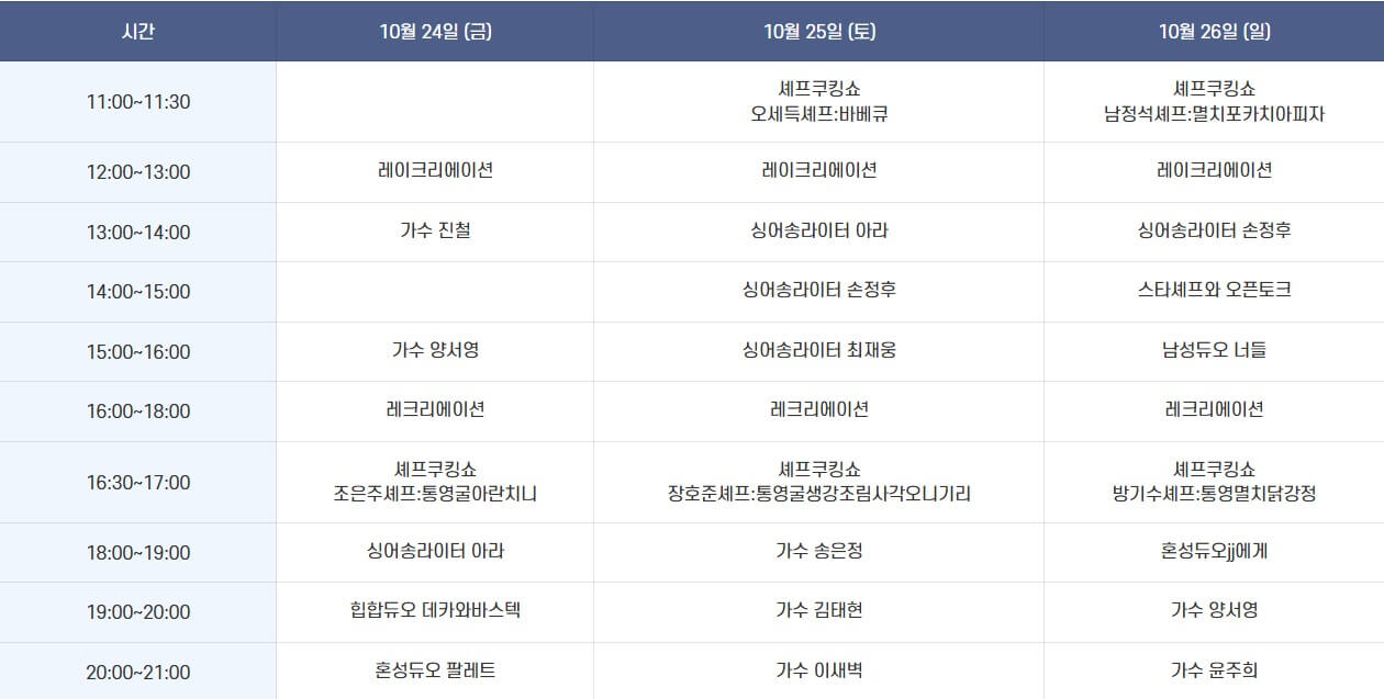 다양한 가수들의 무대 공연과 셰프들의 쿠킹쇼가 준비되어있어요.
