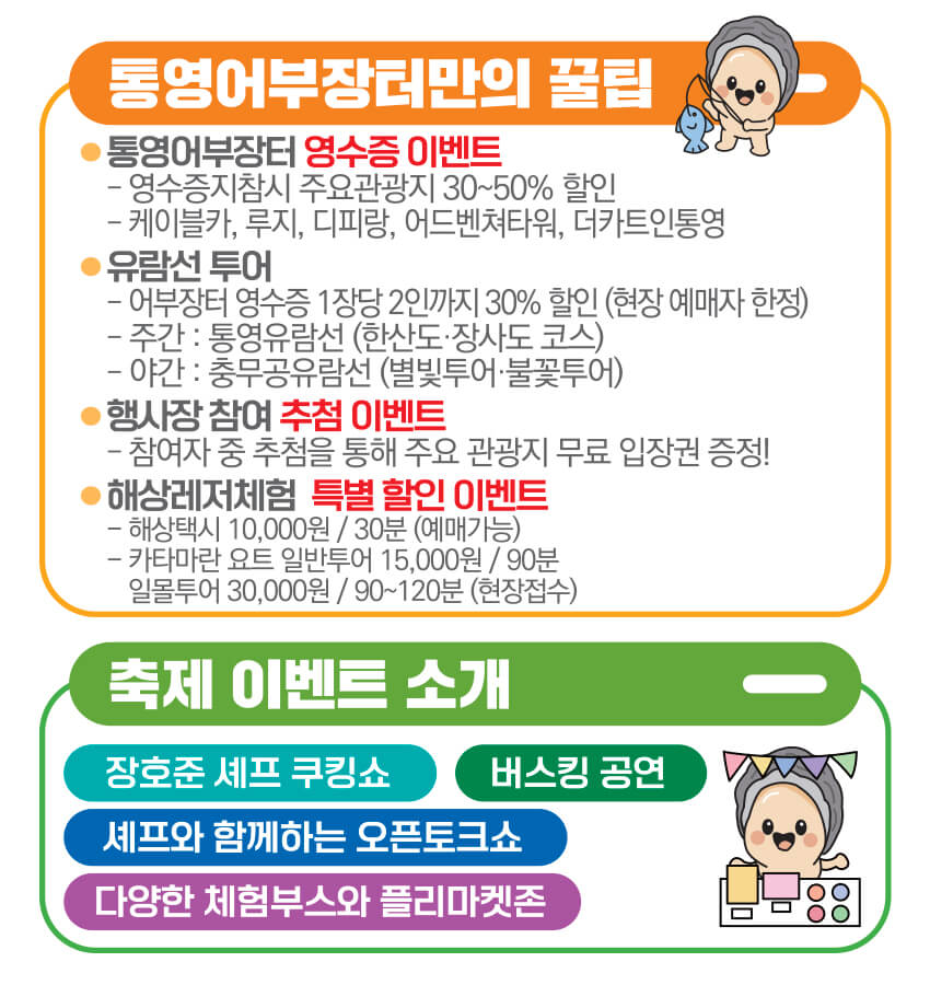 통영 앞바다에서 갓 잡아올린 신선한 해산물 판매부스, 지역 어부들이 직접 운영하는 어부 장터, 관광객이 직접 참여할 수 있는 체험 프로그램 등이 운영될 예정이에요.