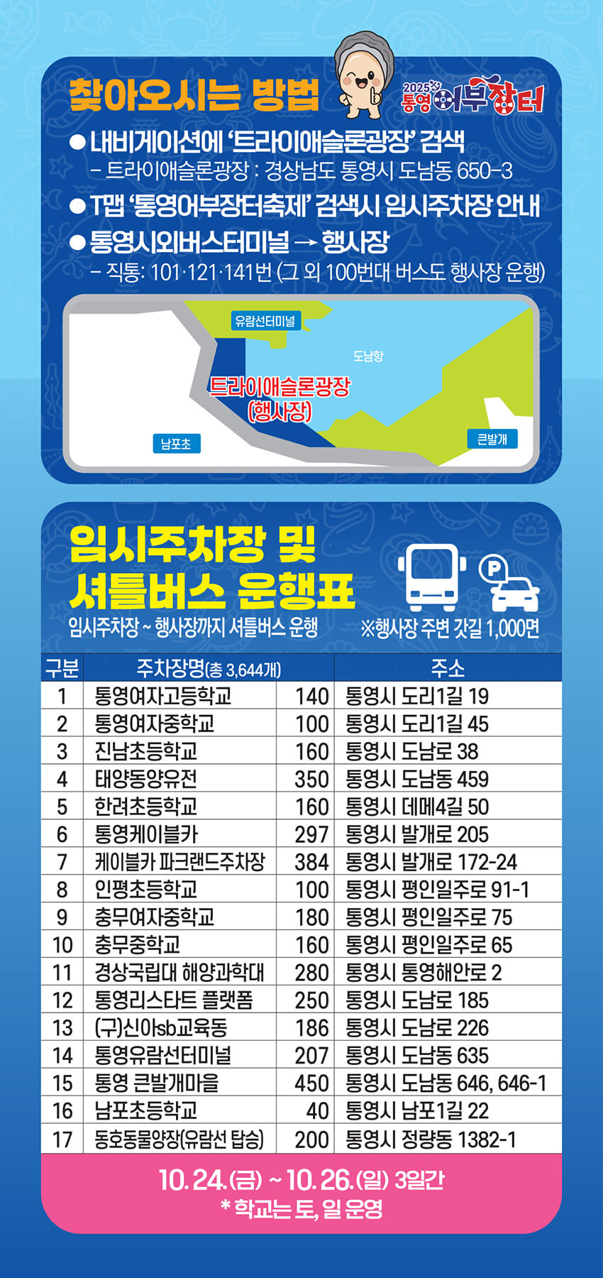 - T맵 검색: ‘통영어부장터축제’ → 임시주차장 안내 확인 가능
