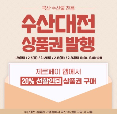 설 기간에는 수산물 전용 모바일 상품권도 발행된다. 해당 상품권은 구매 시점부터 20% 선할인이 적용되는 방식이다.