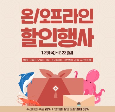 해양수산부와 전국 유통사가 함께 진행하는 설 특별전으로, 국산 수산물을 중심으로 최대 50% 할인 혜택이 제공된다.