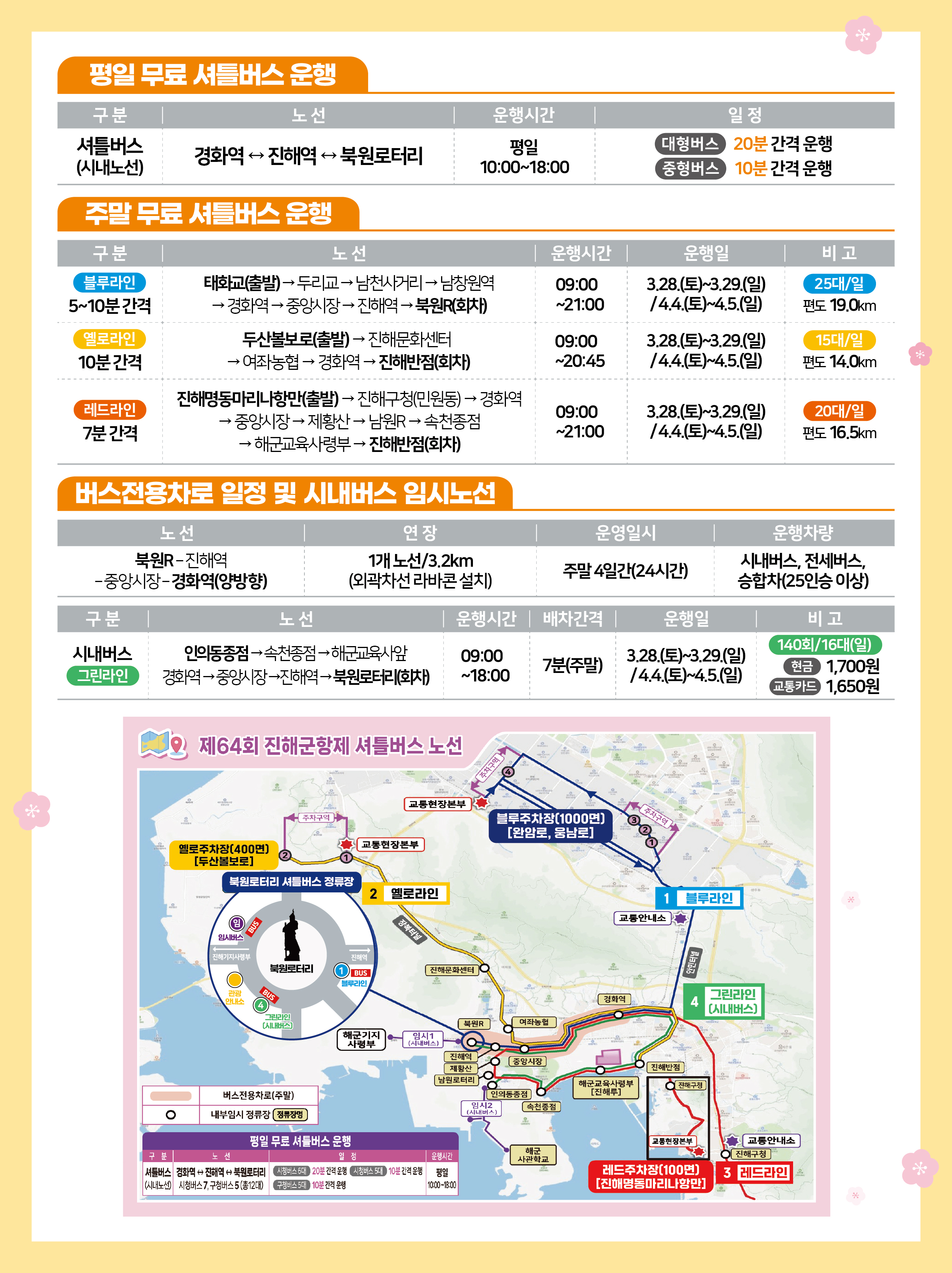 특히 여좌천, 경화역, 중원로터리처럼 거리가 있는 명소를 한 번에 보기 위해서는 셔틀버스 활용이 사실상 필수다.