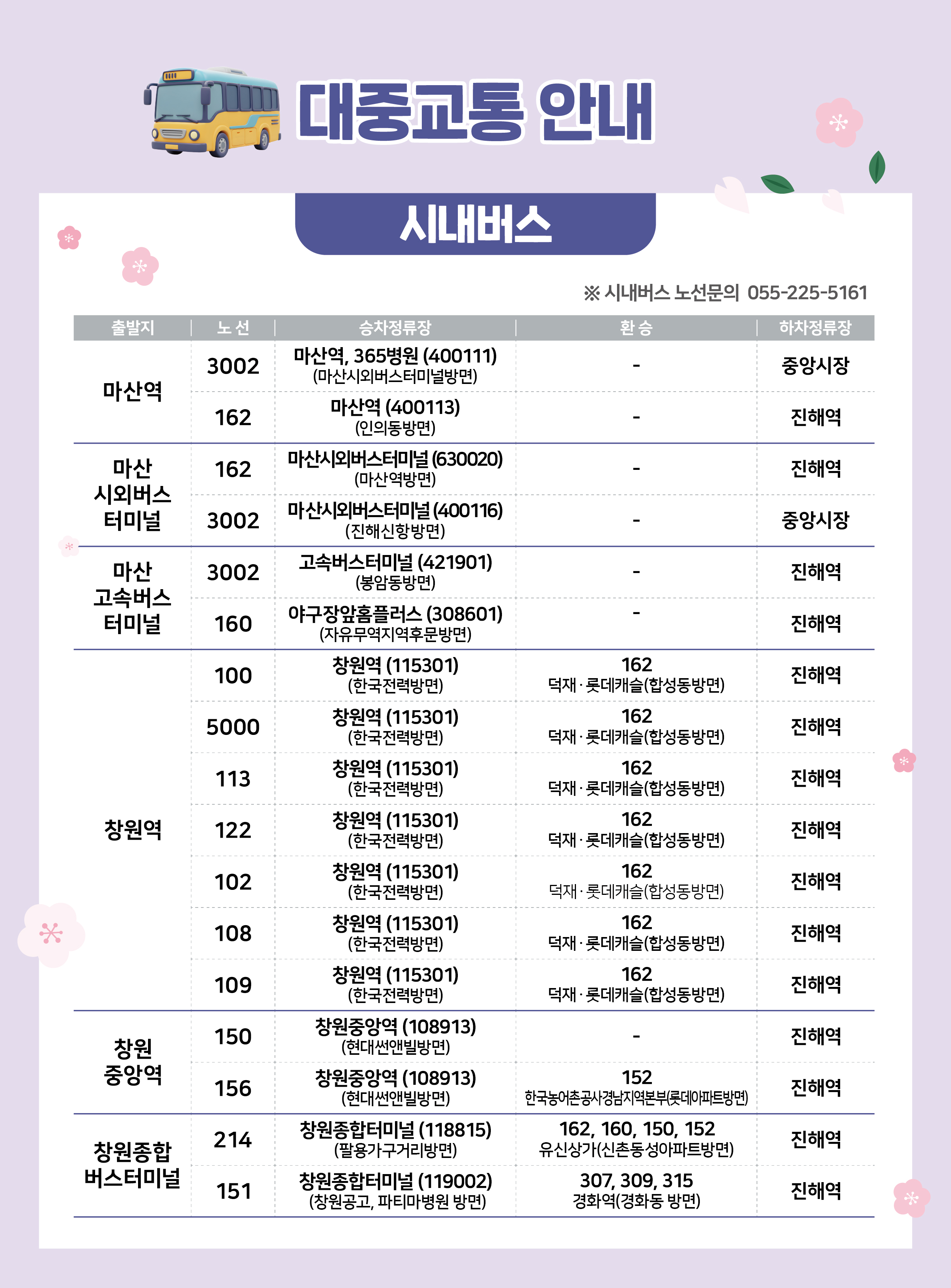 셔틀버스 외에도 시내버스를 활용하면 이동이 훨씬 편해진다. 특히 창원, 마산에서 진해로 이동하는 경우 시내버스 이용이 현실적인 선택이다.