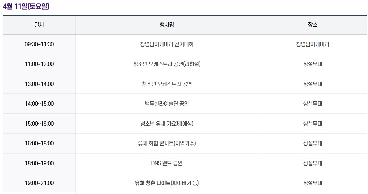 4월 11일은 아침 걷기대회부터 시작해 저녁 청춘 나이트까지 이어지는 일정이다. 공연, 참여, 체험이 모두 들어있는 날이라 하루를 꽉 채워 즐기기 좋은 구조다. 가족 단위 방문객이나 하루 종일 머물 계획이라면 가장 추천되는 날짜다.